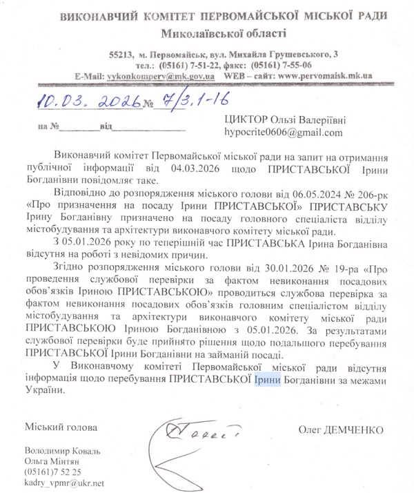 У відповідь на запит «Антикорупційного виміру» Виконавчий комітет Первомайської міської ради Миколаївської області повідомив, що Ірину Приставську призначили на посаду головної спеціалістки відділу містобудування та архітектури у травні 2024 року.