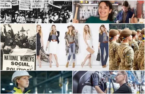 Сьогодні: жінки працюють у всіх сферах — від науки та медицини до служби в армії та бізнесу.