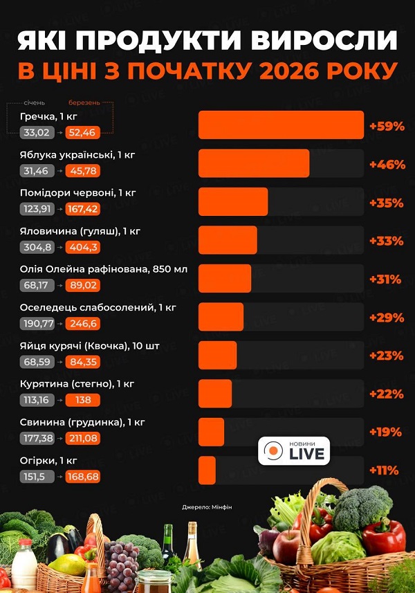 Як пишуть ЗМІ, з початку року найбільше подорожчала гречка – з 33 до 52,46 грн за кг (+59%). Яблука зросли у ціні на 46%, помідори – на 35%.